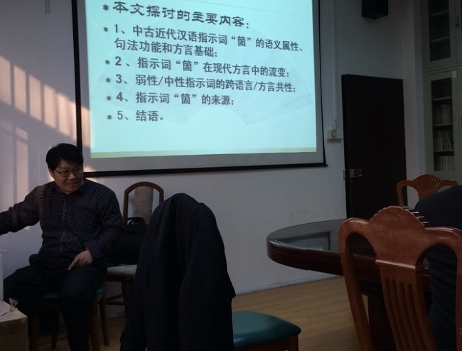 2014年12月8日下午3:00,应浙江大学汉语史研究中心邀请,复旦大学中文系梁银峰副教授在西溪校区人文学院314会议室进行了题为《中古近代汉语指示词“�(�、个)”的语义属性及其在现代方言中的流变》的学术报告。本次报告由史文磊博士主持,陈玉洁博士担任点评。到场听取报告还有李旭平博士、罗天华博士以及十几位研究生。