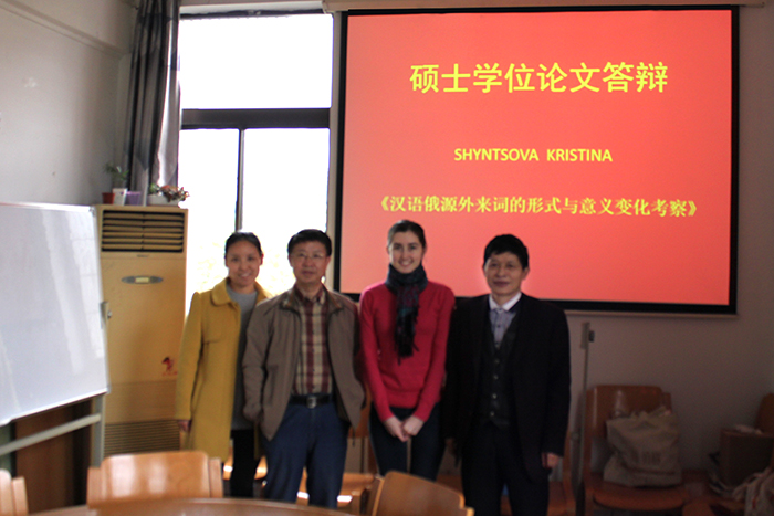2015年11月11日上午10:00,汉语史研究中心中国学专业硕士生SHYNTSOVA,KRISTINA在西溪校区行政楼439会议室进行了答辩,论文题目为《汉语俄源外来词的形式与意义变化考察》。本次答辩邀请浙江外国语学院周明强教授担任答辩委员会主席,浙江大学汉语言研究所池昌海教授、陈玉洁副教授担任答辩委员会委员。