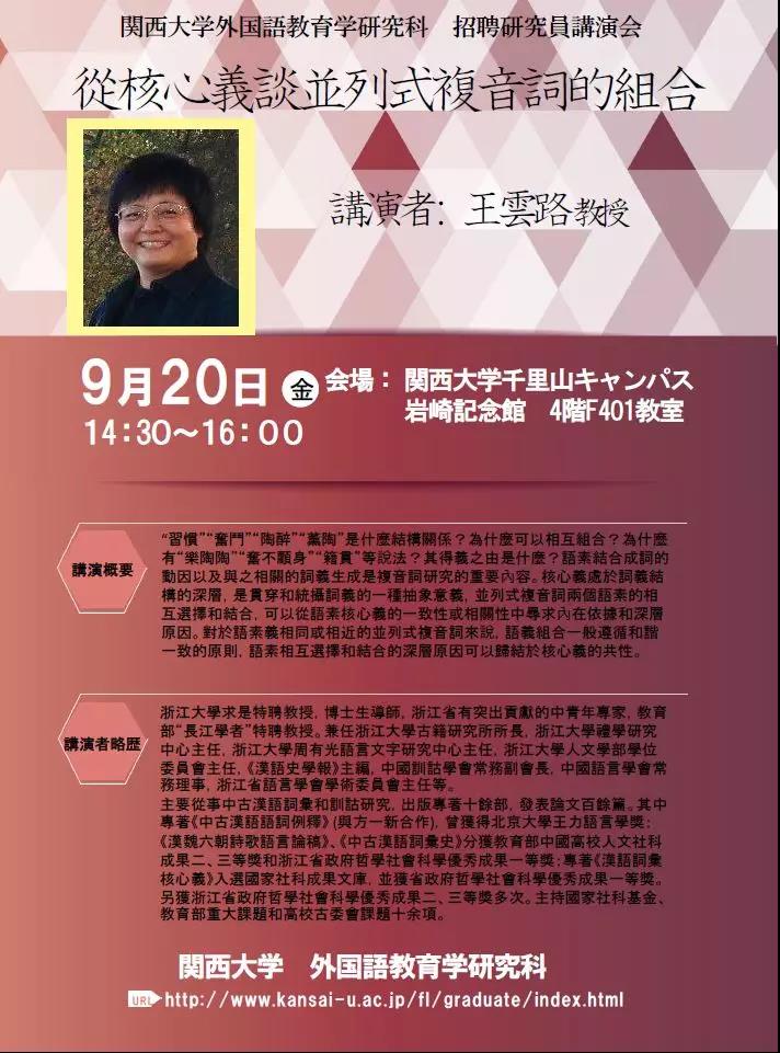 2019年8月22-9月22日,王云路教授应日本关西大学外国语学部玄幸子教授邀请,赴日本大阪关西大学进行学术交流。