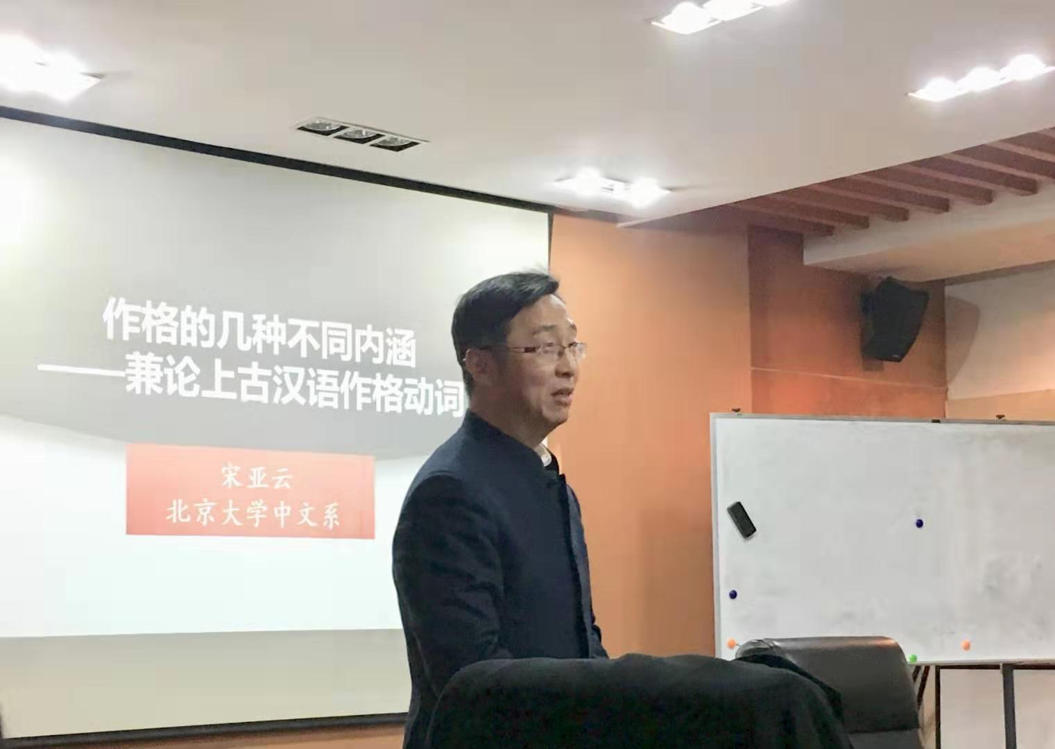 2019年11月29日下午,北京大学中文系宋亚云副教授在西溪校区行政楼229室作了题为《作格的几种不同内涵——兼论上古汉语作格动词》的报告。汉语史研究中心史文磊老师为本次讲座的主持人,汪维辉老师、罗天华老师出席此次讲座,中文系、古籍所等相关单位的许多同学也纷纷前来聆听。