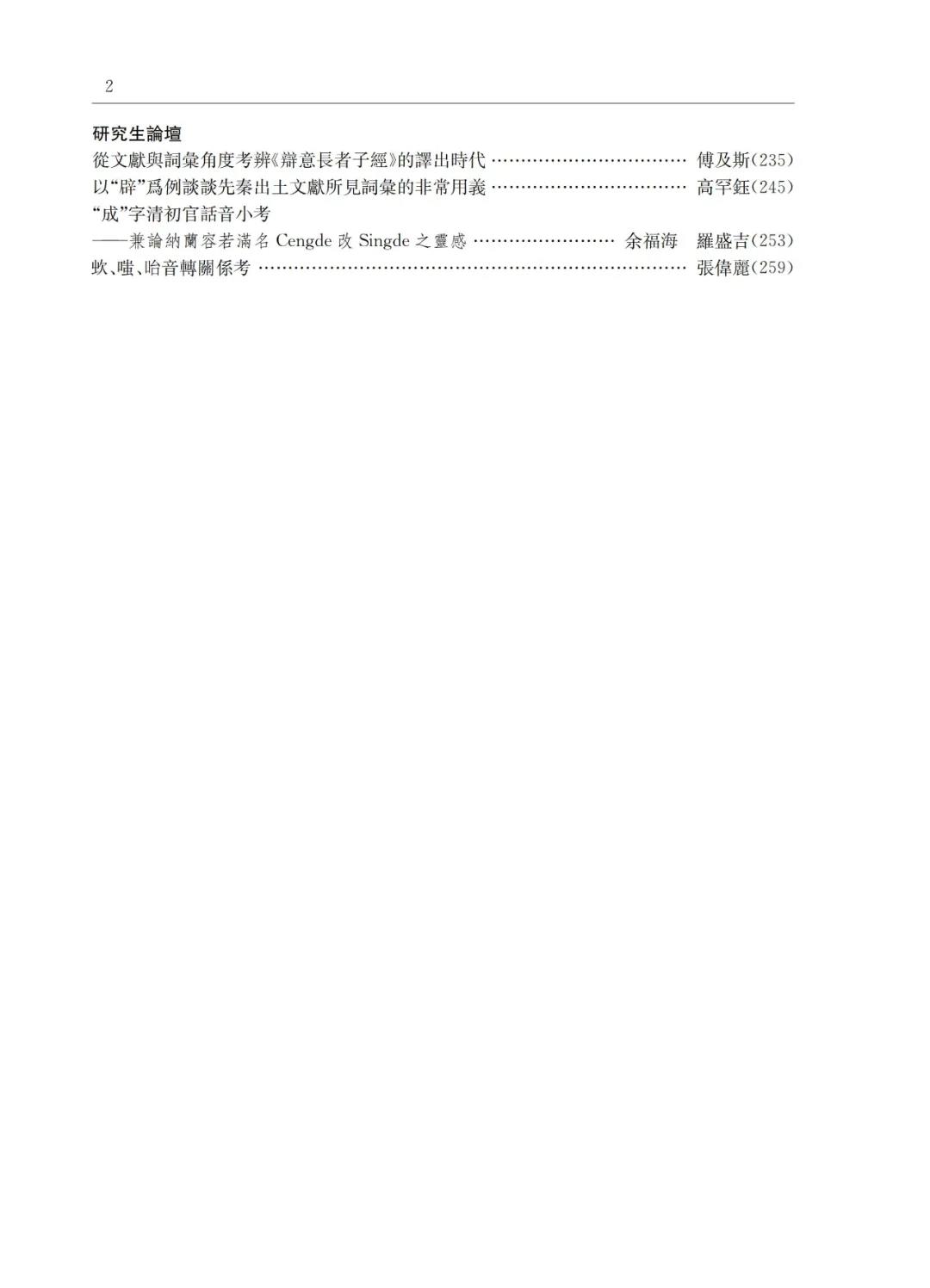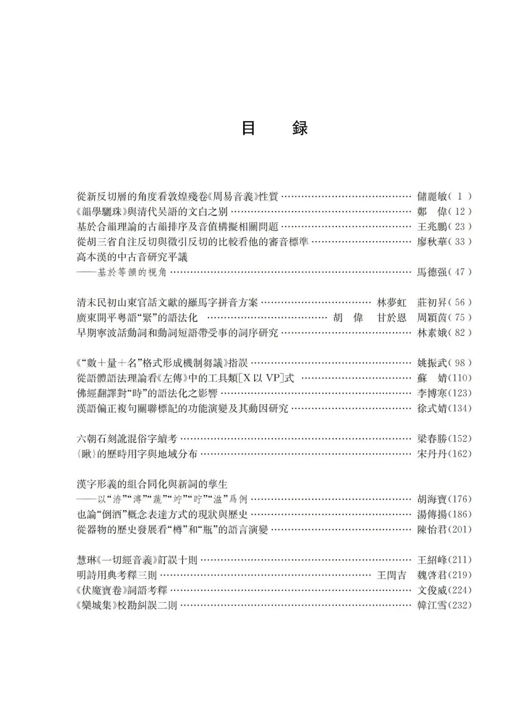 日前,《汉语史学报》第二十四辑由上海教育出版社出版。本辑共收录汉语史研究论文23篇,主要分为音韵、语法、文字和训诂词汇四个版块,另设研究生论坛,反映了相关研究领域的新成果。音韵方面涉及敦煌音义、近代韵书、注释反切、中古音研究史、清初官话、同源词音转等内容;方言、语法方面涉及语法化、词序、“数+量+名”格式、语体语法、复句关联标记等内容;文字方面涉及石刻文字考证和汉字形义关系等内容;训诂词汇方面涉及概念表达方式和名物词的历史演变、诗歌用典和宝卷词语考释、出土文献词义训诂等内容。此外还有文献校勘和疑伪佛经考辨等。
