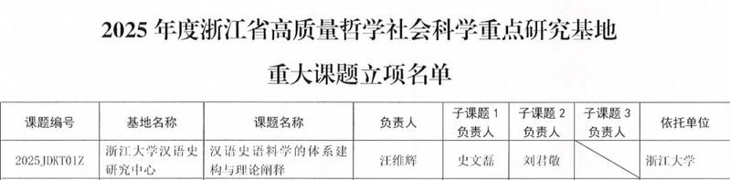 近日,浙江省哲学社会科学工作办公室公布了2025年浙江省高质量哲学社会科学重点研究基地重大课题立项名单。中心汪维辉教授主持申报的“汉语史语料学的体系建构与理论阐释”获批立项。
