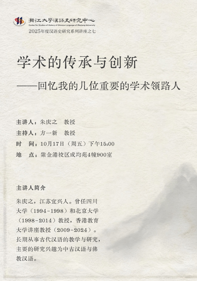 朱庆之,江苏宜兴人。曾任四川大学(1994-1998)和北京大学(1998-2014)教授,香港教育大学讲座教授(2009-2024)。长期从事古代汉语的教学与研究,主要的研究兴趣为中古汉语与佛教汉语。